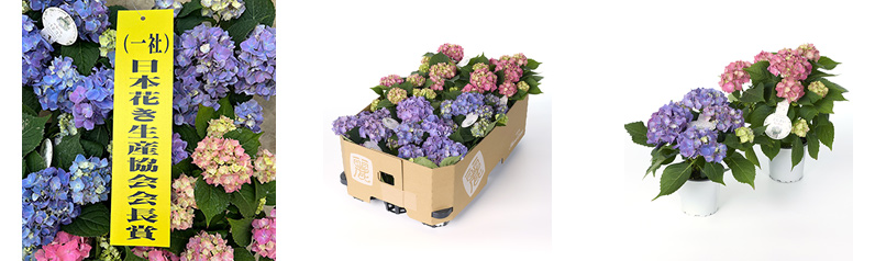 本来は5号鉢での流通が主流となるアジサイを、3号ポットという小さなサイズに仕立てながらも、驚くほど充実した花付きに仕上げています。この完成度は、生産者・吉岡さんの確かな技術力と極わい性のオリジナル品種であってこそ。コンパクトにまとまった株姿は扱いやすく、寄せ植えにも取り入れやすい絶妙なサイズ感。限られたスペースでもしっかりと季節感を楽しめる、新しい楽しみ方を提案してくれる一品です。小さくても、しっかり華やか。技術と工夫が詰まった受賞作を、ぜひお楽しみください。