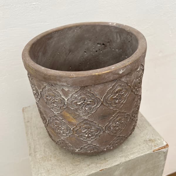 アンティーク風の華やかで存在感があるラウンド型セメント鉢です。底穴がありますので、直接植物を植え込んでください。