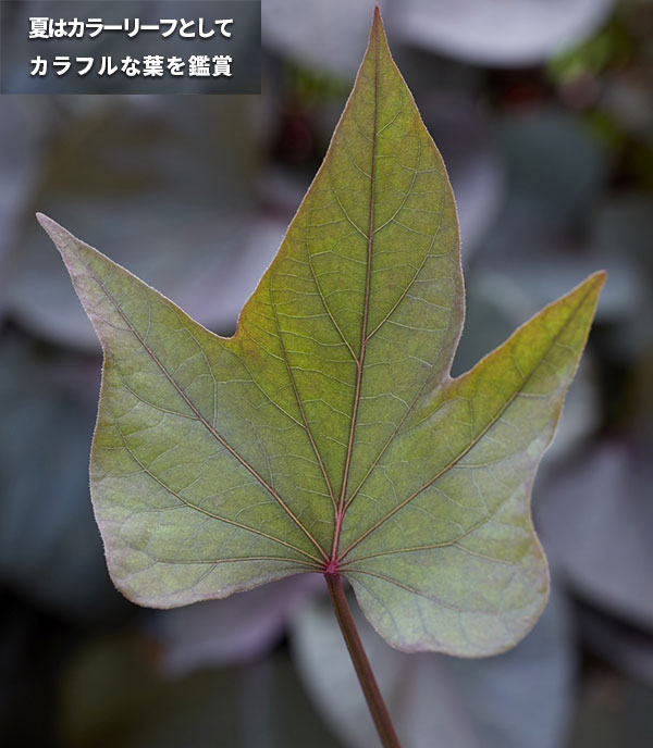 バルコニー、パティオ、パーゴラ、寄せ植えなどにおすすめ。初夏から晩夏まで葉色を楽しんだ後、秋には品種ごとに果皮・果肉の色が異なる栄養価の高い芋を収穫してください。また葉は、健康野菜として食べることもできます。ほうれん草のように栄養価が高く、サラダやスムージーなどで数百年も前から食されてきました。ビタミンB、ベータカロチン、鉄、カルシウム、亜鉛、プロテインなどが含まれています。
