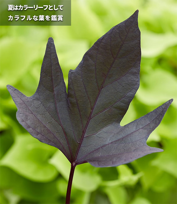 バルコニー、パティオ、パーゴラ、寄せ植えなどにおすすめ。初夏から晩夏まで葉色を楽しんだ後、秋には品種ごとに果皮・果肉の色が異なる栄養価の高い芋を収穫してください。また葉は、健康野菜として食べることもできます。ほうれん草のように栄養価が高く、サラダやスムージーなどで数百年も前から食されてきました。ビタミンB、ベータカロチン、鉄、カルシウム、亜鉛、プロテインなどが含まれています。