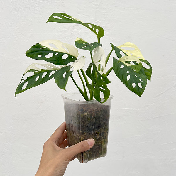 ★現品販売★しっかり斑が入ったマドカズラを、ネガミエルにねこチップで植えた一株です。一般市場にはなかなか出回らない希少品を、この機会に是非手に入れてください。ステムもきれいに斑が入り将来性は抜群です!マドカズラ(窓鬘)は名前の通り、葉に窓のような穴があくモンステラの仲間です。葉に穴があくのは、熱帯雨林のスコールにあたって葉が破れないようにするためといわれています。明るい緑色の葉が美しい観葉植物です。半つる性になります。モンステラに比べて葉が小さいので、インテリアでも使いやすい品種。南国の雰囲気満点。高温多湿を好み、葉から空気中の水分を取り込む植物なので、年間を通してときどき霧吹きで葉に水をかけてください。