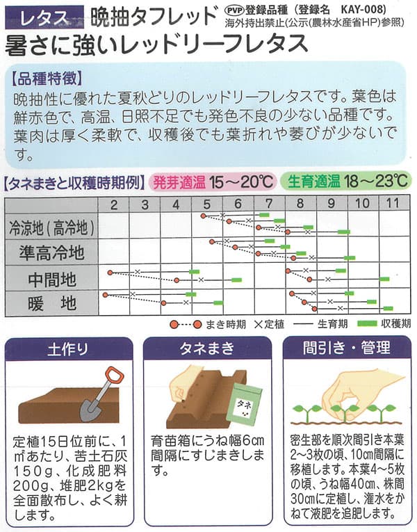 まき時:冷涼地5-8月、中間地・暖地2-4月と8月