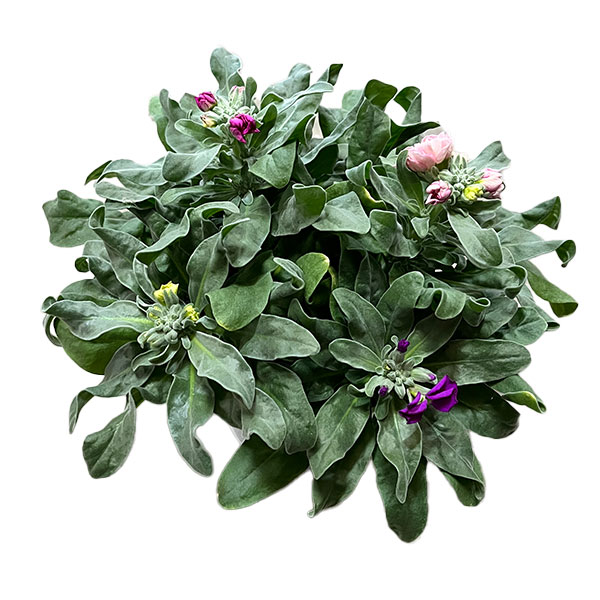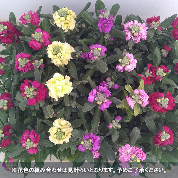 明るいパステルカラーの花色と甘い香りが魅力のストック。寒さに強い1年草で、冬から春にかけて開花します。4色の花を寄せ植えしたカラフルな鉢植え。そのまま飾って楽しめます。★花色の組み合わせは見計らいです。また、一重と八重の花が混在する鉢植えとなります★