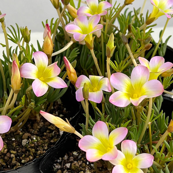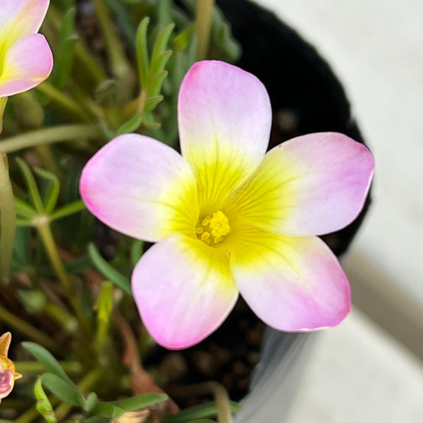 「くみこ」は細く柔らかな葉に、ふんわり淡いピンクの花が可愛らしいオキザリスの新品種!やさしい陽光を透かすような可憐さがあります。中心のイエローもワンポイントです。