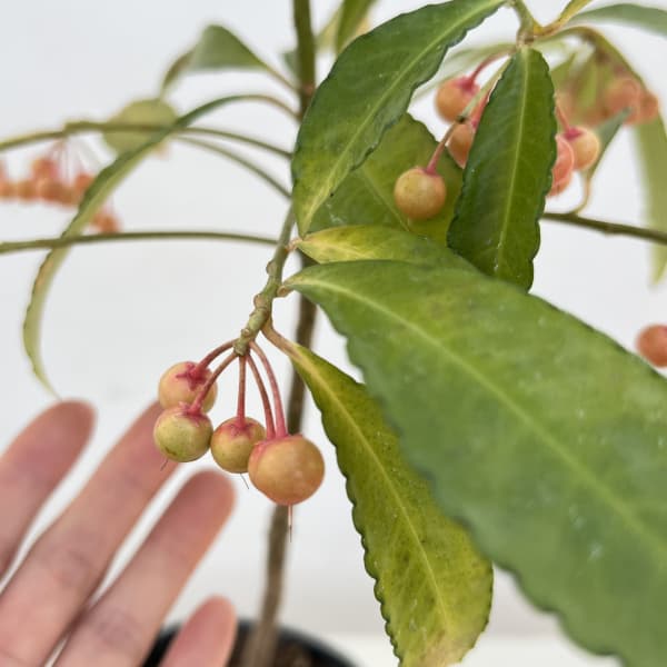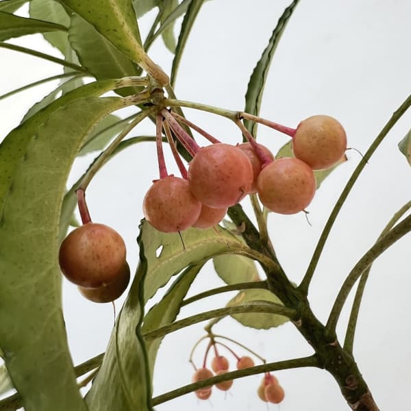 お正月の縁起物としておなじみの万両(マンリョウ)。赤い実がすずなりになり、晩秋から冬の庭を印象的に彩ります。景気のよい呼び名が年の初めにふさわしく、江戸時代から愛好者の多い古典植物です。センリョウと異なり樹形が乱れないので、鉢栽培に適しています。また、お庭の樹木の根締めとしてもおすすめです。この品種は可愛らしいピンク色の実がなる人気品種です。