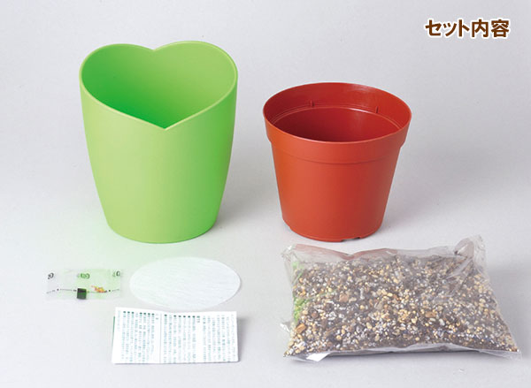 セット内容:ハートポット(プラスチック製)、インナーポット、鉢底シート、培養土、種、説明書(日本語/英語)。ボックスパッケージ入り