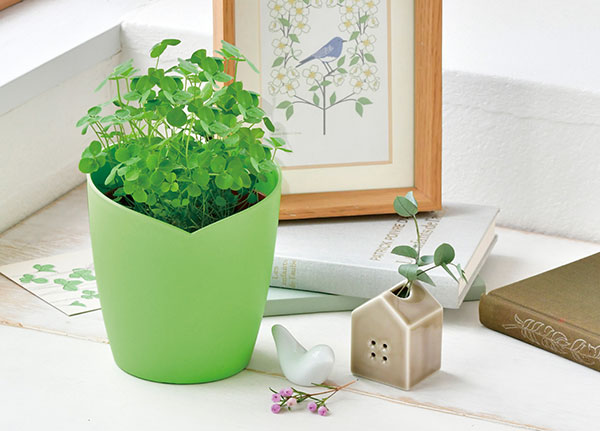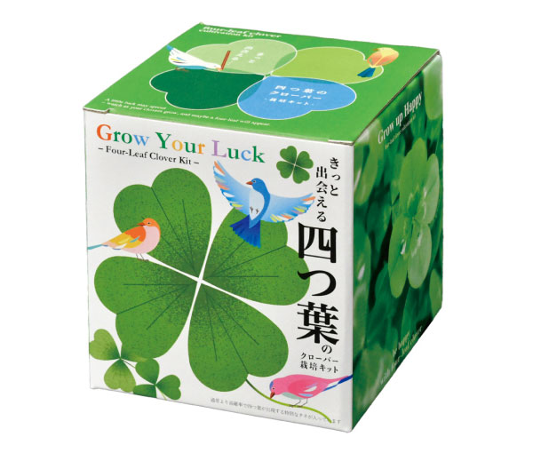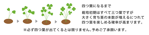 四つ葉のクローバーの種を使用した栽培セットです。自然に生育した四つ葉のクローバーを発見する確率は通常1万分の1といわれています。また、「四つ葉のクローバー」としてよく流通しているものは、球根または苗(オキザリス・デッペイというカタバミ科の植物など)で、本来のクローバー(シロツメクサ)で四つ葉の種子としての販売は少ないです。この栽培セットにはニュージーランドで生まれた、高確率で四つ葉になりやすい特別なクローバーの種が使用されいますので、高確率で四つ葉のクローバーが出てきます。栽培初期はどの葉もすべて三つ葉ですが、株が大きく育ち茎の本数が増えてくると四つ葉が出てきて楽しめるようになります。栽培時期や生育の度合いにより異なりますが、タネまき後2~3か月で四つ葉が出てくるサイズになります。※品種の特性から、必ず四つ葉が出てくるとは限りませんので、あらかじめご了承ください。