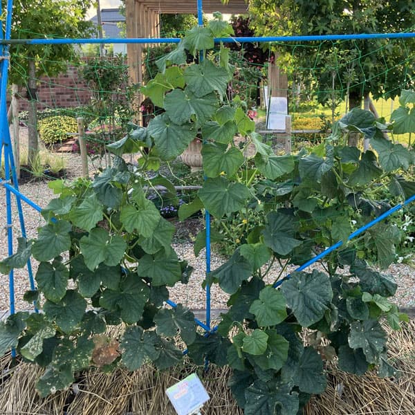 畑の場合、株間50cm以上で植えつけて下さい。植え込み直後は風で折れたりしないよう、株元の茎を仮支柱に結わえておきます。大きく生長してきたら、2mほどの支柱を立て、伸びてくる「つる」がからみ易いよう、紐やネットを張って備えておきます。つるはぐんぐん伸びるので、1週間に1度は支柱などに麻紐で誘引して茎葉が折れないようにします。
