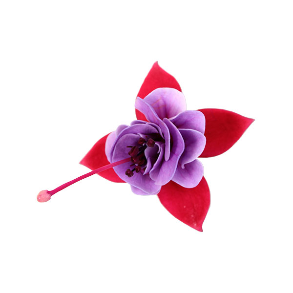 下向きに咲く愛らしい花姿。ボリュームのあるフリルが魅力的なフクシアです。鉢植えでお楽しみください。咲き終わった花摘みをすることで次々と花を咲かせることができます。ジュリアは枝垂れタイプ。フリルの多いパープルとホワイトの花です。