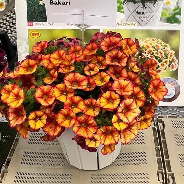 カリブラコア・ウノバカリ(ウノBakari)はレッド、オレンジ、イエローが混じる斬新な花色が特徴のタキイ種苗オリジナル品種です。一重咲きですが、次々とお花をつけるため存在感があります。分枝性に優れ、コンパクトに仕上がるためハンギングバスケットや大鉢にもおすすめです。