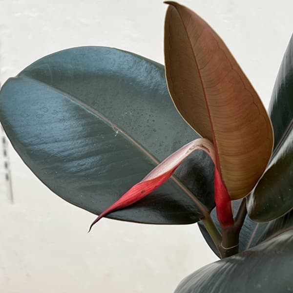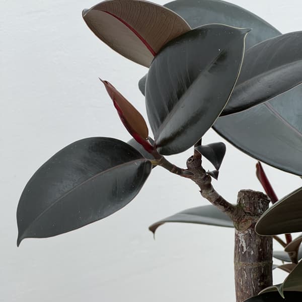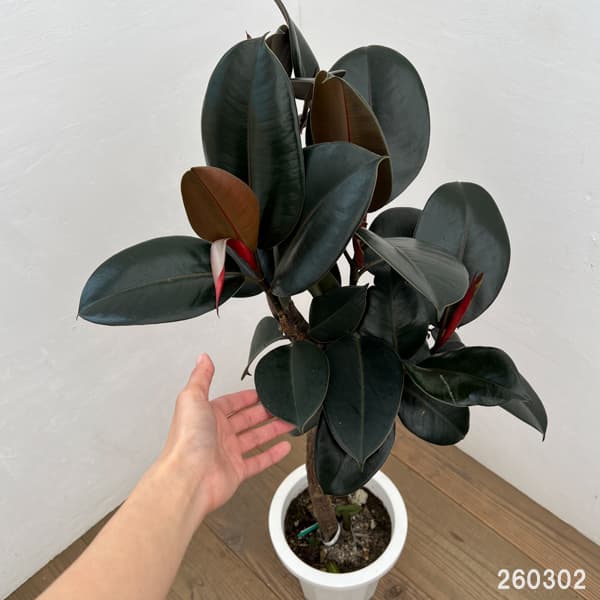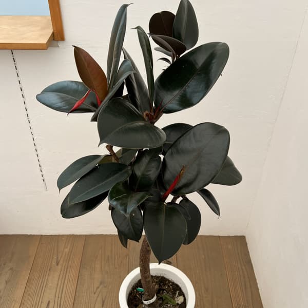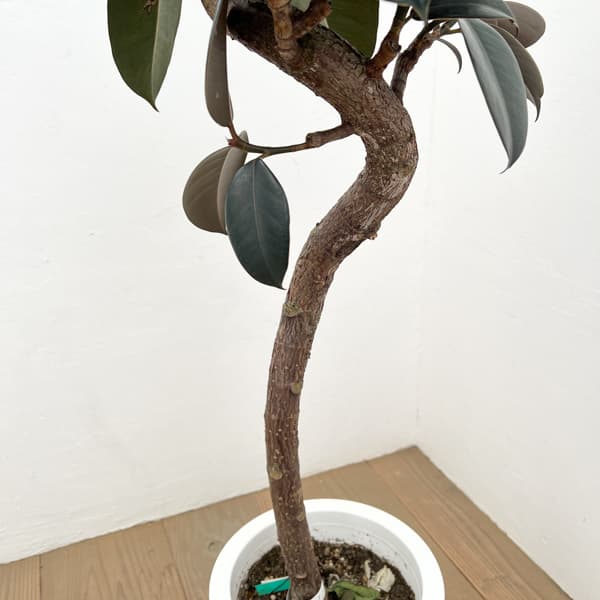 美しく丹念に仕立てられた曲がり仕立てのバーガンディです。フィカス・バーガンディは観葉植物として人気の高い「ゴムの木」の仲間です。 インド原産で、耐寒性、耐陰性にすぐれ、育てやすい品種です。葉が赤黒味を帯びて大人っぽい雰囲気。さらに新芽は赤くなるので、鮮やかな色の対比も楽しめます。耐陰性はありますが、室内ではなるべく明るい場所に置くと美しい葉色を保ちます。春と秋に戸外の太陽光の下に出すとより葉色が冴えます。耐寒性は5度以上で、20度以上になると生育しはじめます。