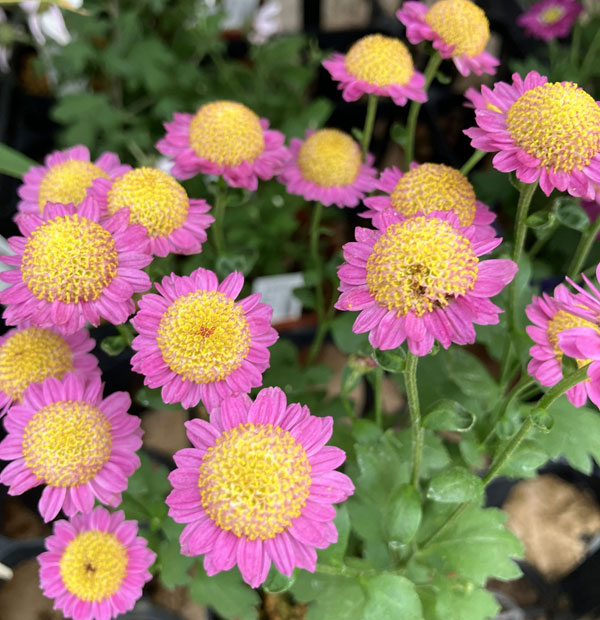 とても小さな小菊です。かわいらしい小さな花をたくさん咲かせます。4号くらいの小さな鉢に仕立てると愛らしさが引き立ちます。ももえはコロンとした小輪の桃花を咲かせる品種です。咲き進むにつれ、中心の筒状花が盛り上がってポンポンとした花形になります。