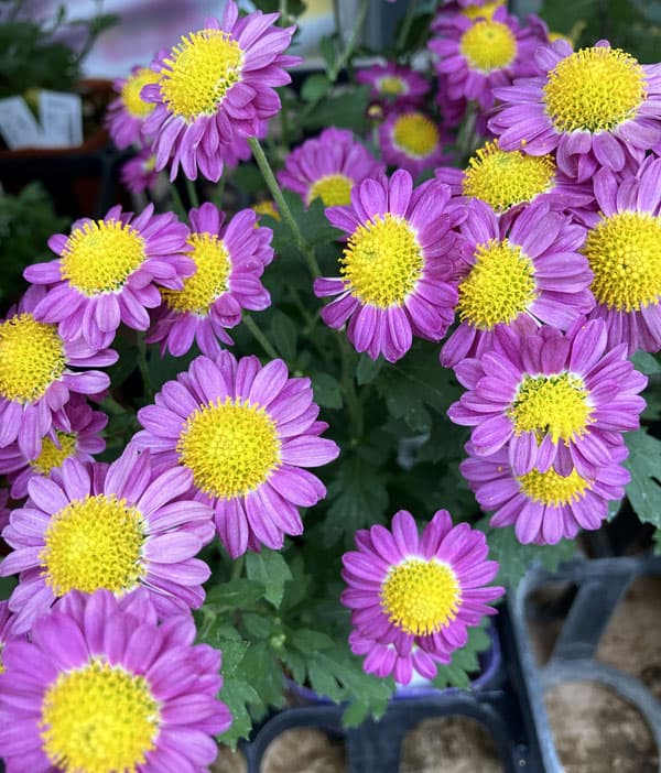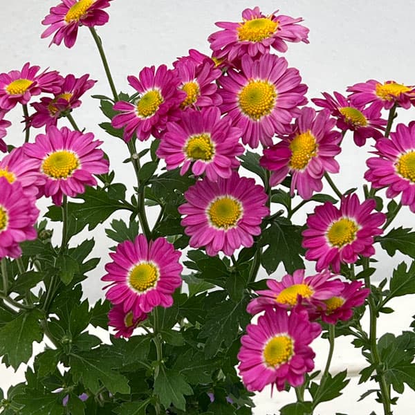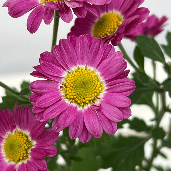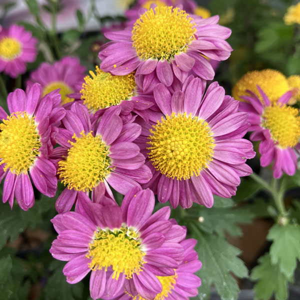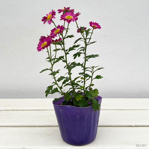 とても小さな小菊です。かわいらしい小さな花をたくさん咲かせます。4号くらいの小さな鉢に仕立てると愛らしさが引き立ちます。みわは花径3cm未満程度の小輪の赤紫~桃花を咲かせる品種です。咲き進むにつれ淡いピンクになり、中心の筒状花が盛り上がってポンポンとした花形になります。