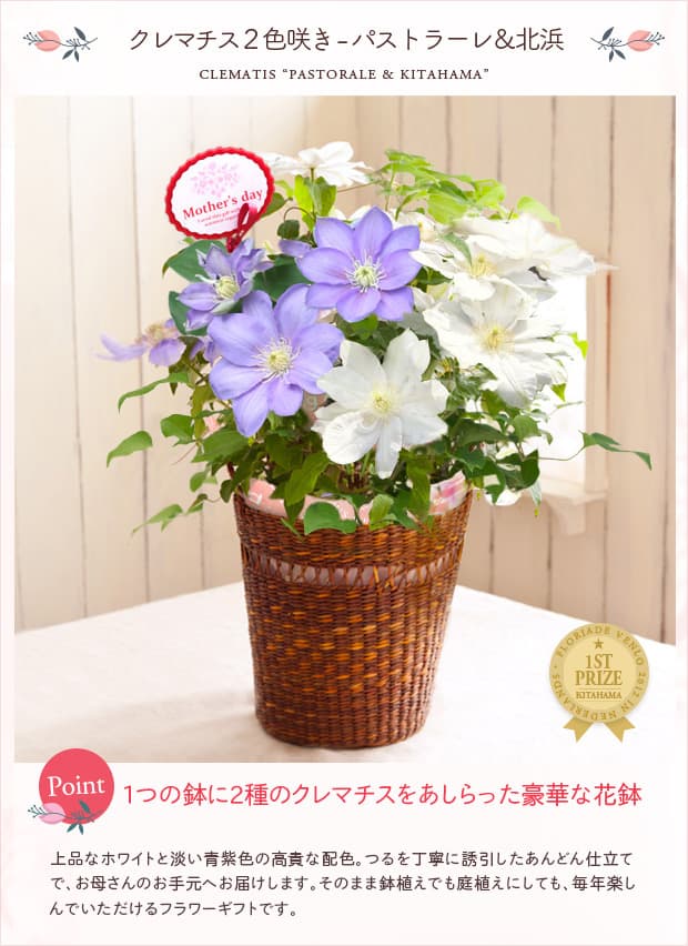 母の日ギフトにぴったり!花つき抜群の有名2品種(パストラーレと北浜)が一つの鉢で楽しめる豪華な2色咲きです。