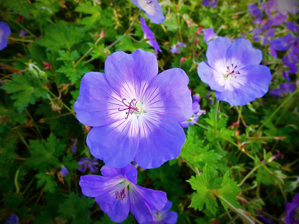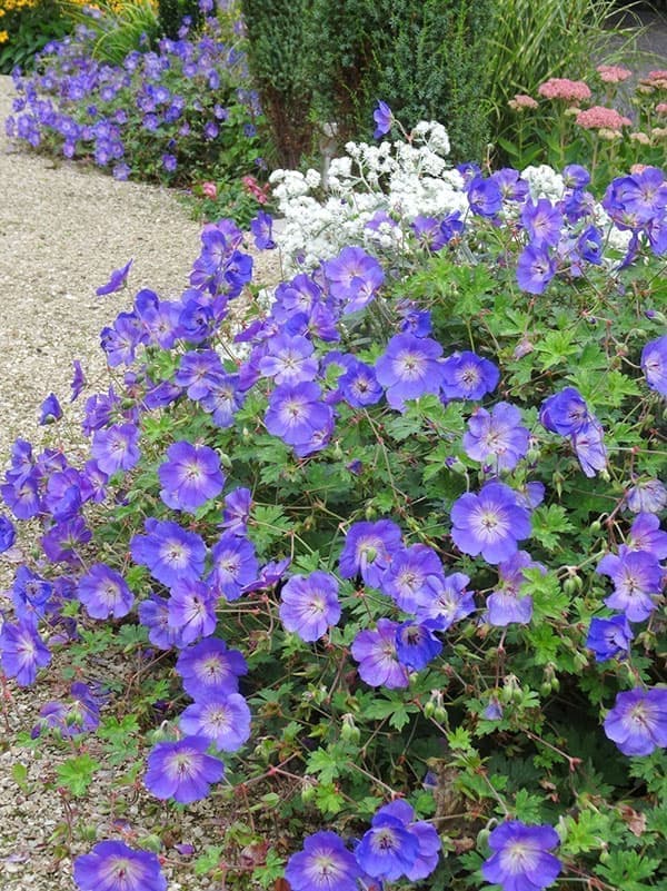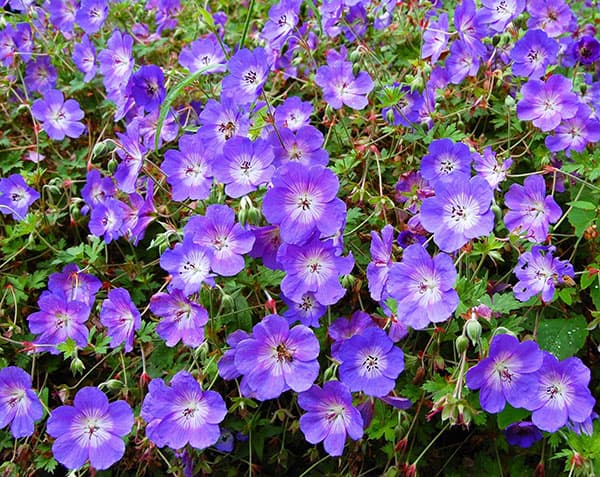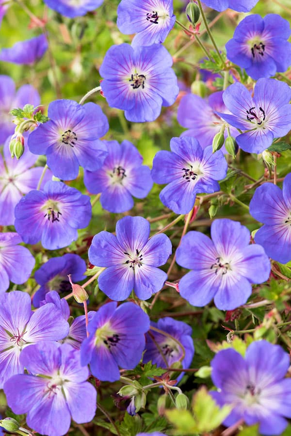 ロザンネイは、これまでになく丈夫で耐暑性の高いフウロソウです。バイオレットブルーの丸弁花が夏の暑さにも負けず長い間次々に咲き続けます。草丈15cmくらいから咲き始め、開花しながら育ち30~50cmの草丈となります。春と秋にはバイオレットブルーの花の中心が白色となり、いっそう美しくなります。横に広がるので、ハンギングバスケットにも映えます。コンテナやロックガーデンにも最適。また、バラと一緒に植えると開花期も重なり、お互いに引き立てあう最高のコンパニオンプランツとなります。