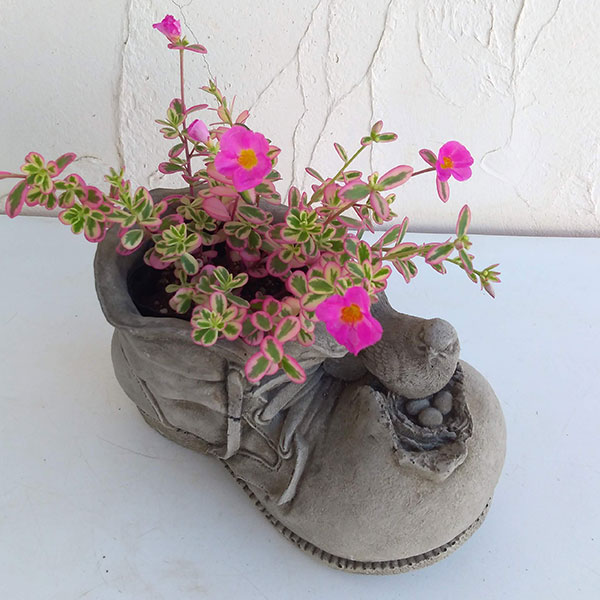 古びたブーツに小鳥がとまっているデザインのオーナメント鉢。花を植えこむときれいです。