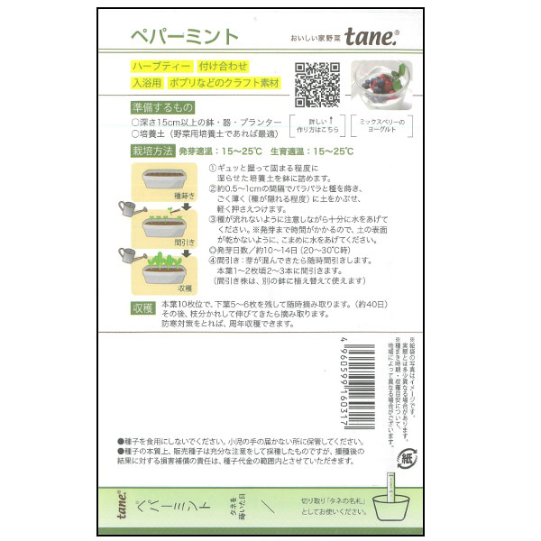 スッキリした味わいと香りが強く、食用にはもちろん、消臭効果やお風呂に浮かべてミントバスも楽しめます。誰でも簡単に栽培できます。