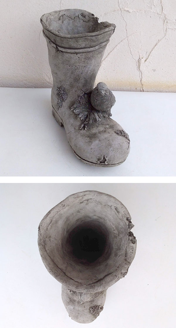 古びたブーツに小鳥がとまっているデザインのオーナメント鉢。花を植えこむときれいです。
