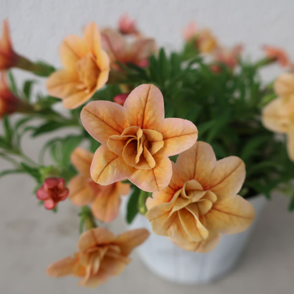人気の八重咲きカリブラコア。ウノシリーズはカンタンに育ち、花がらを摘む手間が要らないのが魅力です。ペチュニアの八重品種に比べ、花がたくさん咲き、雨にも強いです。