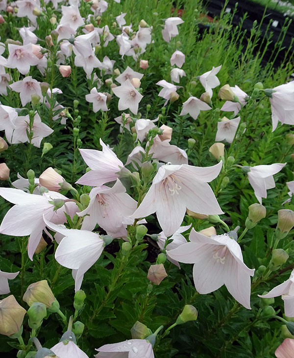 キキョウは万葉の時代から愛され、秋の七草に数えられる和の花ですが、自然環境下での開花は7月下旬から9月にかけて、実際には盛夏に咲く花です。日本らしい清楚な雰囲気が魅力ですが、暑さにも寒さにも強く強健な宿根草で、どんな土地でもよく育ちます。切花や茶花としても趣があります。この品種は花壇のまとめ植えや、ナチュラルガーデンの混植にも適した山野草系の晩生種です。千葉大学名誉教授であり「ガーデンそよかぜ」園主でもある安藤敏夫さんが、世界の人々を日本らしい花で迎えようと選抜育種した品種です。花色や花形のバリエーションがたくさんあるシリーズです。どんな花が咲くかはお楽しみ!