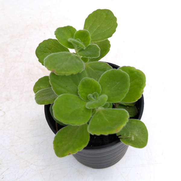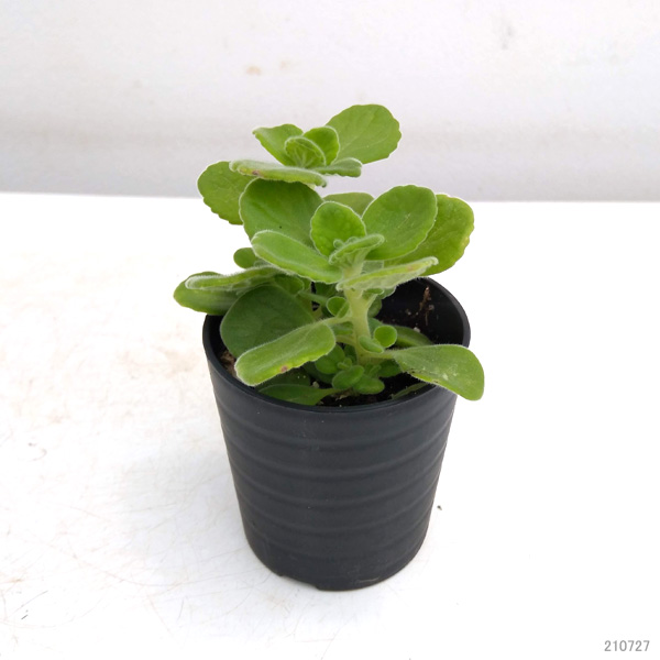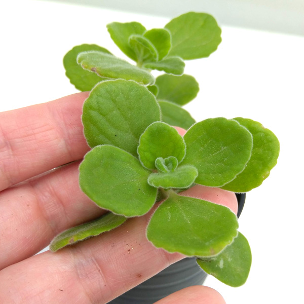 多肉質でベルベットのような葉をもつアロマティカス。インド~南アフリカ原産のシソ科の多年草で、多肉植物にもハーブにも分類されます。丸くて産毛がある可愛い葉が人気で、葉をこするとミントに似たとても良い香りがします。お菓子やオムレツなどのお料理に利用したり、紅茶に入れてハーブティーとして利用できます。鉢植えで栽培できますが、日光を好むので、よく日の当たる場所で管理してください。