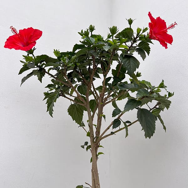 ハイビスカスは夏には欠かせない熱帯花木です。次々に花を咲かせ、花色もバラエティに富んでいます。レッドスターは赤いハイビスカスの代表的な品種です。高さのあるスタンド仕立ての株です。