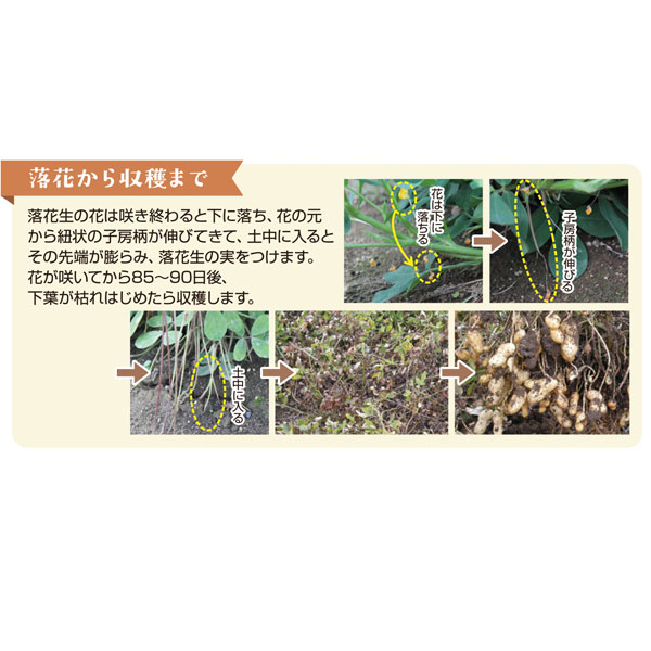 花が咲くころに除草をし、株の周囲の土をやわらかく耕しておきます。落花生は花が咲いた後に子房が土にもぐって太り、豆ができません。表土が硬いと、子房がうまく土の中にもぐれないので、周囲の土を柔らかくしておくことがポイントです。水はあげないと実が大きくならない場合があります。