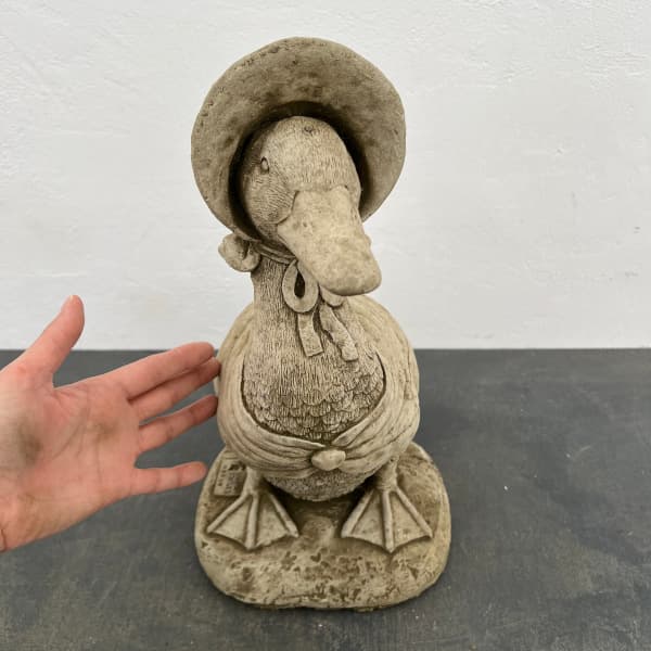 英国製の高級ストーンオーナメント。1つずつハンドメイドで雰囲気のあるテイストになっています。見た目以上に重量があります。独特の雰囲気とどっしりした質感が特徴。庭園の装飾にご利用ください。スカーフをまとい、帽子をかぶったお洒落なあひる。少し大型です。お庭の草花の間に置けば、見る人の心が和みます。