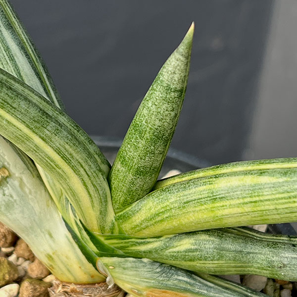 ★日本初入荷!超希少株★ボンセレンシスの変異種から生まれたサンセベリアで、全体的に白からクリーム色の美しい斑模様が素晴らしい逸品です。葉挿しで増やそうとすると緑の葉になってしまい、子株として出てきた株のみ美しい色になります。それも年に1株出るか出ないか。子株のみでの増殖のため、入手は非常に困難です。現在市場に出回ってる株は世界で見ても数株のみの、大変貴重な株になります。