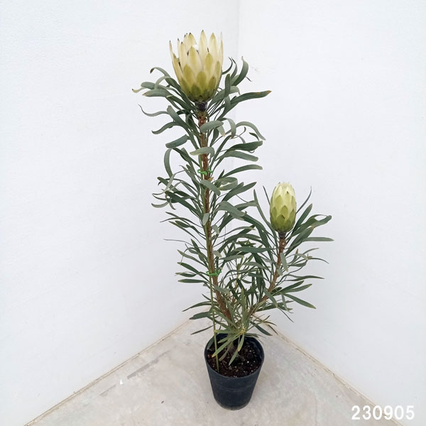 プロテア属はオーストラリアや南アフリカなどに分布する常緑低木です。多数の花が集まって頭状花序をなし、着色した総苞が美しくそれを取り囲みます。花持ちがよく切花として注目され、またドライフラワーになります。ハニーグローはクリーム色の花を咲かせます。植え替える時は肥料分の少ない土(特にリン)を使用することをオススメします。※暑さのため葉先や花の先端に傷みが生じることがあります。