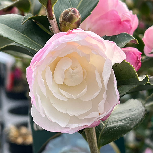 山茶花(サザンカ)はツバキ科の常緑広葉樹。寒椿とよく似ていますが、開花期で区別され、秋から冬に開花します。童謡「たきび」にも謡われ、身近に愛される花です。庭園、景観樹、花木、生垣として幅広く利用されています。剪定に強く、枝がよく横に出るのが特徴です。大和富士は花の外側がピンク色で内側は白色の八重咲き品種です。
