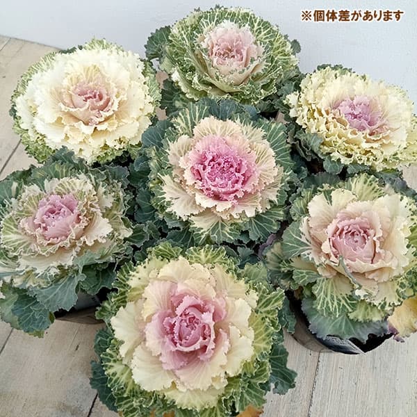 ★入荷から日数が経ったためセール価格となりました。商品の状態は画像と異なる場合があります。★ローブはサカタのタネ育成のフリルタイプ丸葉葉牡丹。葉の重ねがボリューム満点です。直径15~20cmになります。草丈が伸びにくく、キュッとしまった姿で長く楽しめます。ローブピンクバイカラーはクリームホワイトに中心部がラベンダーピンクのハボタン。葉の縁の細かなフリンジは近くで見るととてもきれいです。花の少ない冬の時期、中心部の葉色は低温になるとより美しい色になります。