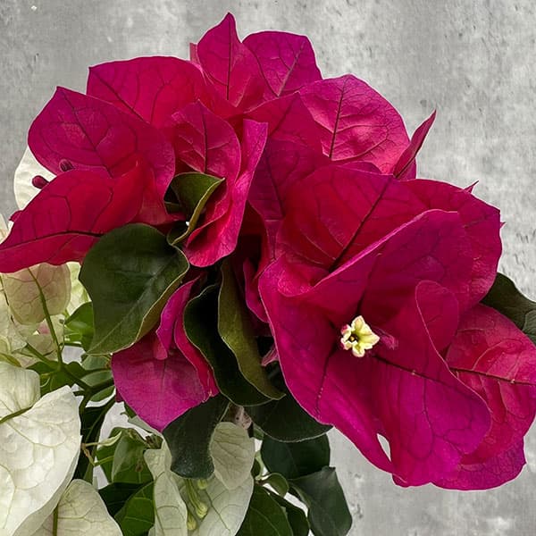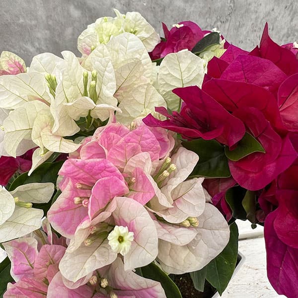 花付のよいブーゲンビレア。チョコレートパフェはサンパフェとサンルージュの寄せ植えの仕立て。サンパフェがホワイトからライトピンクに色変わりし、サンルージュがローズピンクなので、全体として3色仕立てのように見え、とってもカラフルです。大輪大型種で、花付がよい希少な品種です。年に2~3回、繰り返し開花します。