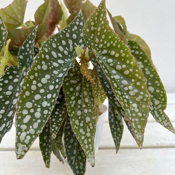 シルバーの水玉模様が美しい木立ベゴニアのホワイトアイスです。観賞用ベゴニアで水玉模様が独特の雰囲気があります。室内やベランダ、玄関前、お庭といろいろなシーンにご利用ください。