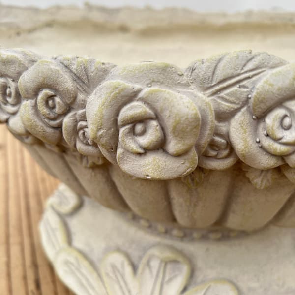 ヴィンテージホワイトの盃型の鉢。バラの縁飾りが優雅です。浅いオーバル型なので、寄せ植えにぴったりです。