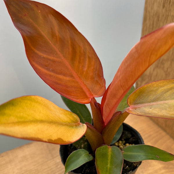 サンレッドは新葉が鮮やかな赤になるフィロデンドロンです。成長するにつれ緑色に変化していきます。耐陰性・耐寒性・耐暑性が強く、とても育てやすい品種です。生産量が少ないのでなかなかお目にかかれません。美しい株姿をお楽しみください。