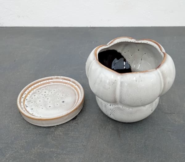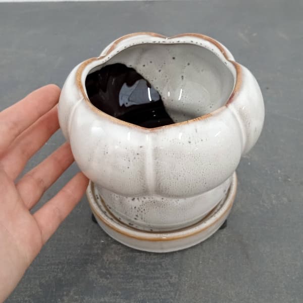 アーティスティックなホワイトカラーの陶器鉢です。ボコボコと凹凸のあるフォルムはインパクト大。見る者を惹きつける個性的な一鉢です。お好きな植物を植えてお楽しみください。