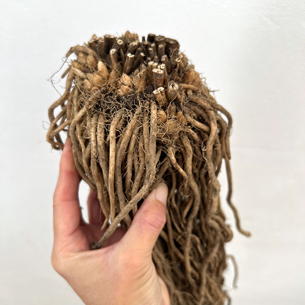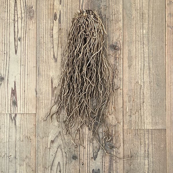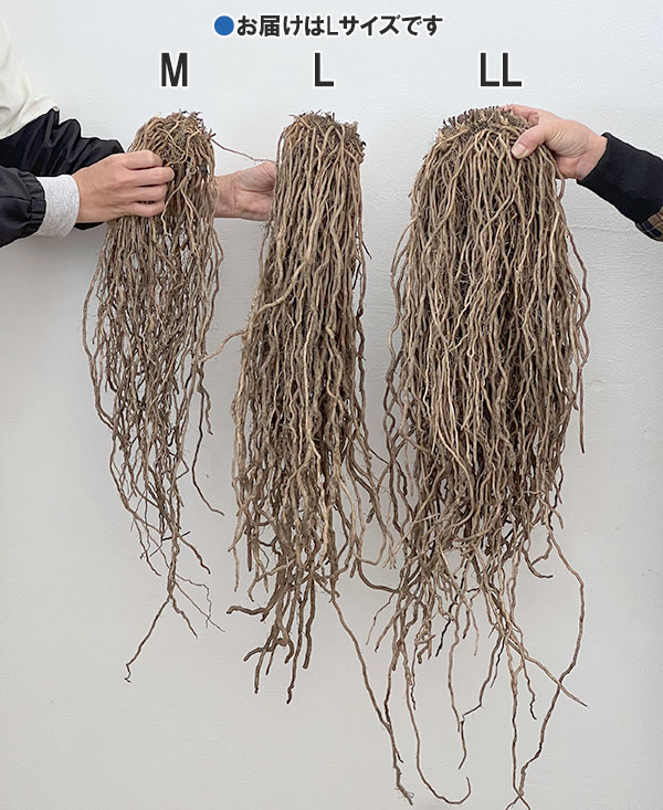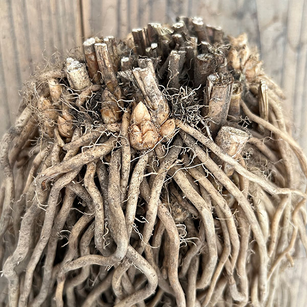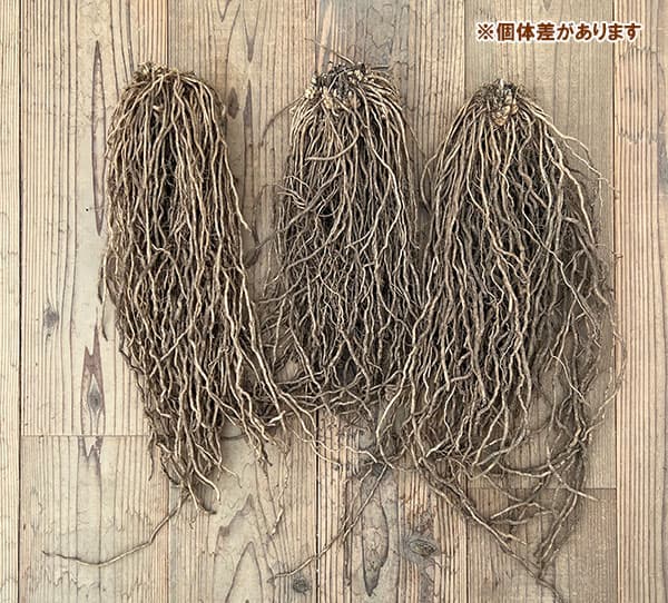 どんな大きな株でも、小さな株が集まって大きな株を形成しています。加工・移動中に株がバラけることがありますが、元の株の大きさになるように株を輪ゴムでくっつけて出荷いたします。根の先端に多少青カビが発生する場合がありますが、生育には問題ありません。