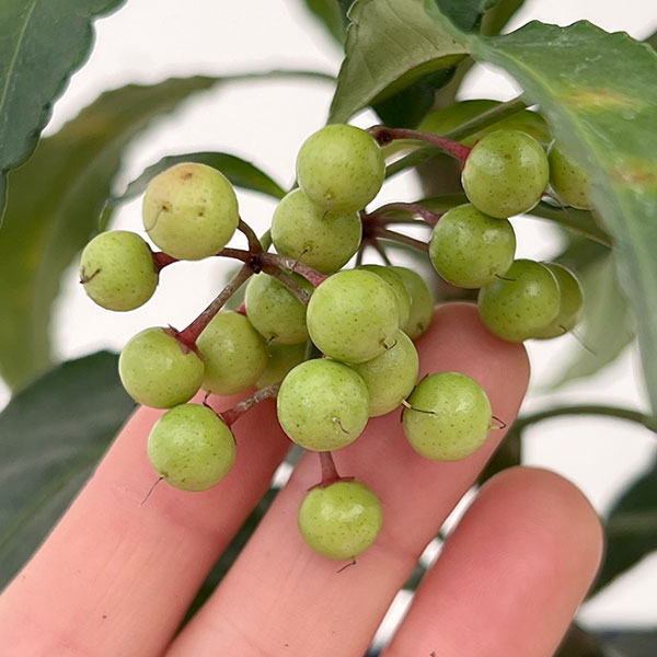 お届けする苗は5号(直径15cm)鉢植えです。樹高は多少変動することがあります。お届け時期により実がまだ色づいていない場合や結実が終了している場合があります。また実が付いている場合でも実の多い少ないなど個体差があります。写真は結実時のイメージです。