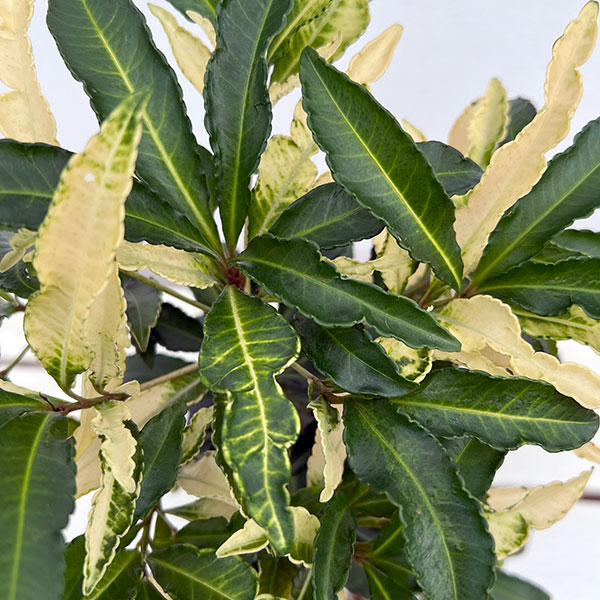お正月の縁起物としておなじみの万両(マンリョウ)。赤い実がすずなりになり、晩秋から冬の庭を印象的に彩ります。景気のよい呼び名が年の初めにふさわしく、江戸時代から愛好者の多い古典植物です。センリョウと異なり樹形が乱れないので、鉢栽培に適しています。また、お庭の樹木の根締めとしてもおすすめです。宝船錦は白掃込斑が入る斑入り葉で赤実の品種です。※斑の入り方は個体差があります。
