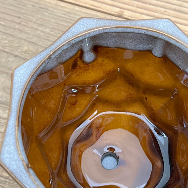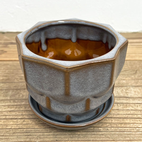 シックなグレーカラーの陶器鉢。少し紫がかったような釉薬の色合いが美しいです。互い違いにぽこっとしたユニークな造形が面白く、インテリア性抜群です。お気に入りの植物を植えてお楽しみください。