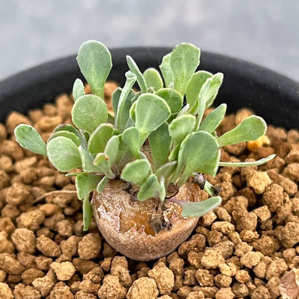 希少な冬型のキク科塊根植物のオトンナ・カカリオイデスです。小型の品種で、最大でも7~8cm程度にしかなりません。塊根はショウガのようなころっとした形をしており、成長するにつれて分岐していきます。同じオトンナの仲間の中でも非常に成長が遅いので、じっくり育ててみてください。※休眠期は葉がない状態でのお届けです。