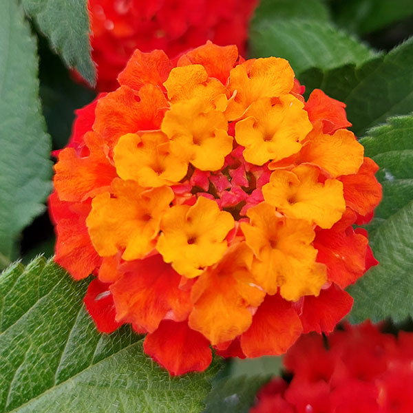 ランタナは熱帯アフリカ原産のクマツヅラ科の花です。小さな花が半球状に集まって、長期間咲き続けるので、花壇や鉢植えでとても楽しめる花です。ジュエルポップは暑さに強く、株がコンパクトで花がたくさん咲くシリーズ。人気のバイカラー品種で、咲きはじめから咲き終わりまでの花色の変化も楽しめます。特に高温期での花持ちは抜群!10度以上あれば繰り返し花を付け、性質も強健です。草姿はボール状にまとまるので鉢植え、寄せ植え、花壇と多様なシーンで楽しむことができます。
