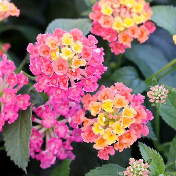 ランタナは熱帯アフリカ原産のクマツヅラ科の花です。小さな花が半球状に集まって、長期間咲き続けるので、花壇や鉢植えでとても楽しめる花です。ジュエルポップは暑さに強く、株がコンパクトで花がたくさん咲くシリーズ。人気のバイカラー品種で、咲きはじめから咲き終わりまでの花色の変化も楽しめます。特に高温期での花持ちは抜群!10度以上あれば繰り返し花を付け、性質も強健です。草姿はボール状にまとまるので鉢植え、寄せ植え、花壇と多様なシーンで楽しむことができます。