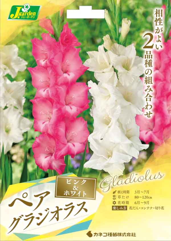 夏の花壇を華やかに彩ってくれるグラジオラス。相性の良い2色がペアになっています。華やかな色の競演をお楽しみください。切花にもおすすめです。