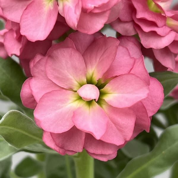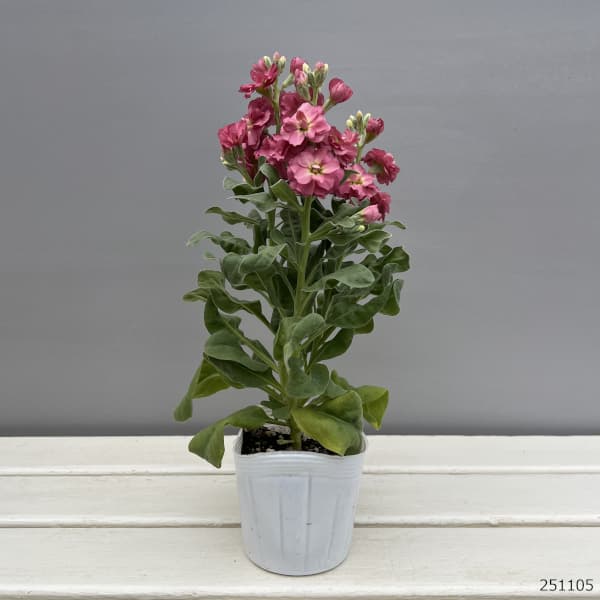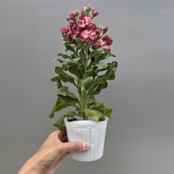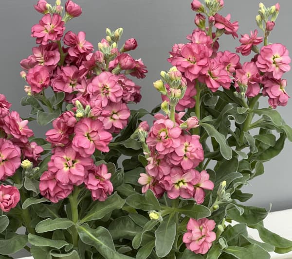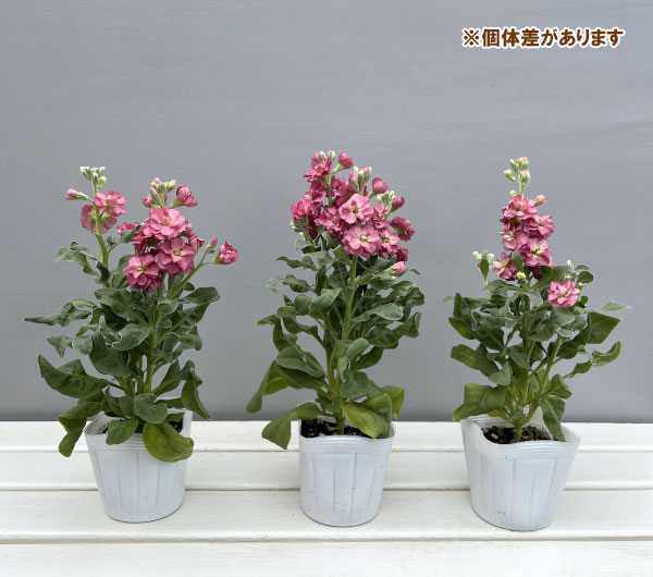 ボリュームのある花と香りが魅力のストック。晩秋~春の花壇の主役になる花です。シャンテは切り花に向く高性のスプレー咲きタイプです。シックな大人カラーのストックです。蕾を早めにピンチ(剪定)すると脇芽が伸びて、たくさんの花が咲くスプレー咲きとなる品種のため、生産者さんが一度切り戻しをかけている株です。