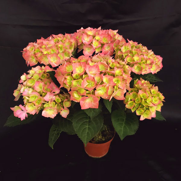 庭に植えられる丈夫で美しい西洋アジサイ、HBAシリーズです。HBA(オランダ・ドイツ合同紫陽花協会)が作出・推奨する優れたガーデン向きの品種です。鉢花として楽しむだけでなく、花壇に植えて何年も繰り返し花を咲かせることができます。株姿がコンパクトで、多花性で、花色が美しく変化する、といった優れた特徴を持つ品種群です。スイートリップスは大輪の一重てまり咲き品種で、グリーンとピンクとオレンジが混じった個性的な花色が魅力的です。