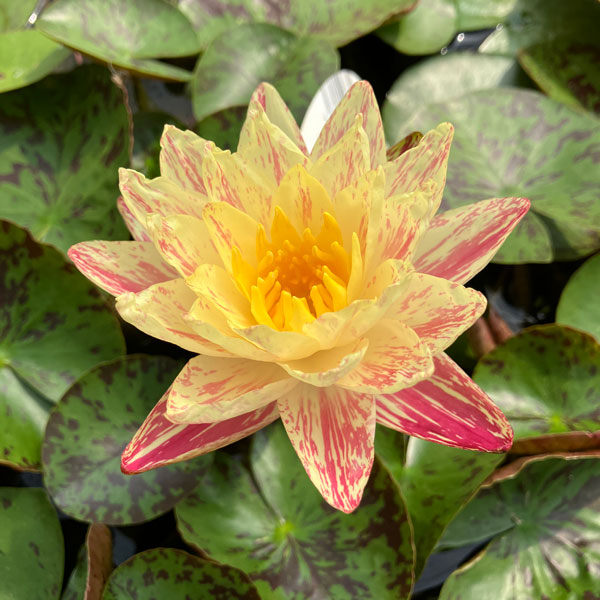 パラニーは今までのスイレンにはあまりなかった、黄色の花に濃い紅色の斑が鮮やかなレア品種です。夏ごろになると特によく咲き、咲き始めは斑の色が薄く黄色のスイレンという印象ですが、暑くなるにつれてだんだんと斑が濃くなっていきます。花色が変化していく様子も楽しめ、今までとは違うスイレンが欲しい方にも非常におすすめです。国際睡蓮コンクールでも受賞経歴のある優れた品種です。