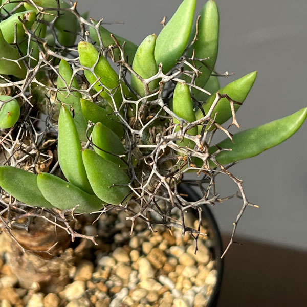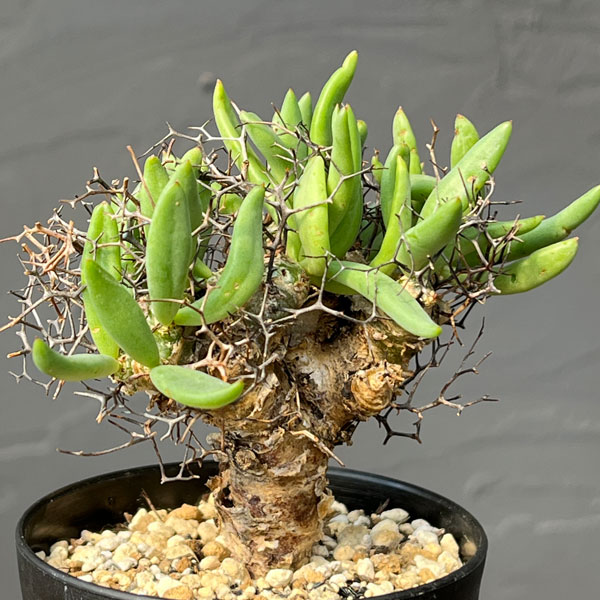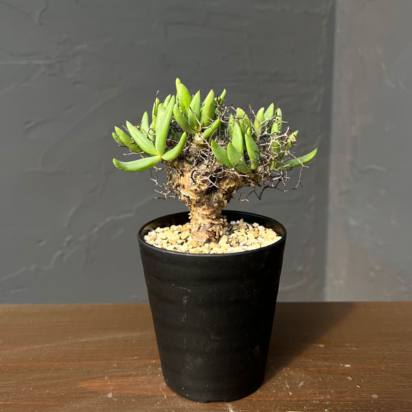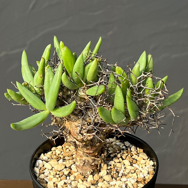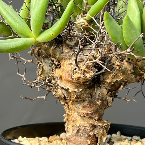 植え替えは8~11月ごろが適期です土は水はけの良いサボテン・多肉植物の専用用土を使います。深めの鉢を用意し、塊根部分の幹肌が鑑賞できるよう、根元数センチを用土に埋めしっかりと固定します。植え付け時に緩効性肥料を少量土に混ぜます。
