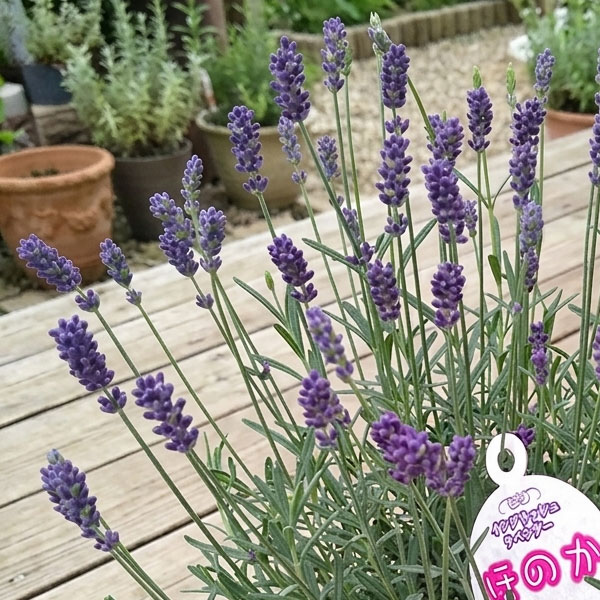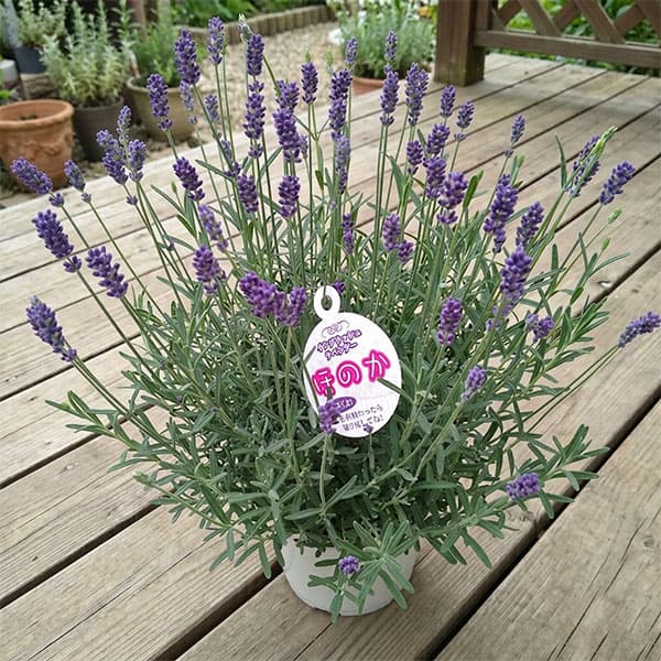 ほのかは、岩手県で育成された二季咲き性のイングリッシュラベンダーです。イングリッシュ系ラベンダーの中では対処性が強く、中部地方以南の暖地でも比較的うまく育ちやすい品種です。濃い青紫色の花穂と非常に強い香りを持つ優れた品種です。開花期の草丈は30~40cmとコンパクトにまとまるので、鉢植えでも管理しやすいです。春に咲いた花を切り戻しておくと、また蕾が上がり、約1ヶ月後にまた咲く二季咲き種です。枝がたくさん立つので花が多く、ボリューム満点の株姿となります。